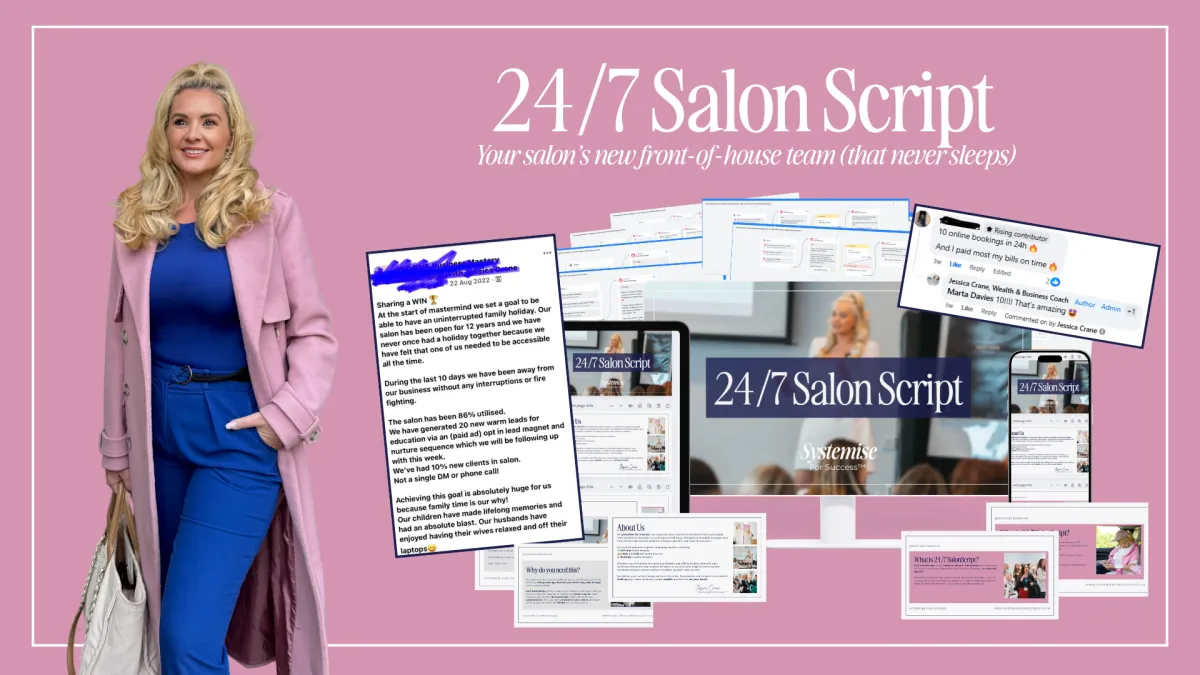 You’ll get instant access to our exclusive members area where all of the 24/7 Salon Script assets are ready for you. This includes pre-written, plug-and-play flows covering everything from client enquiries, monthly promotions, FAQs, recruitment messages, and more. These are complete with an in-depth session with Jessica so you know exactly how to install and personalise everything, abosolutely no tech experience needed.